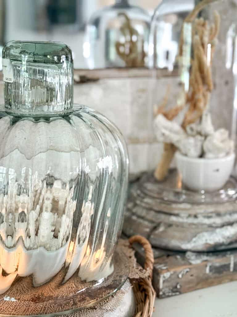 Our glass front cupboard wall is where I love to enjoy a beautiful display of seasonal vintage finds. Through thrifting, I’ve been adding to my vintage kitchen accessories collection. All of a sudden I’ve got a wonderful collection of colorful pottery bowls. Other old kitchen items are added here and there, along with seasonal decor (and more scales).