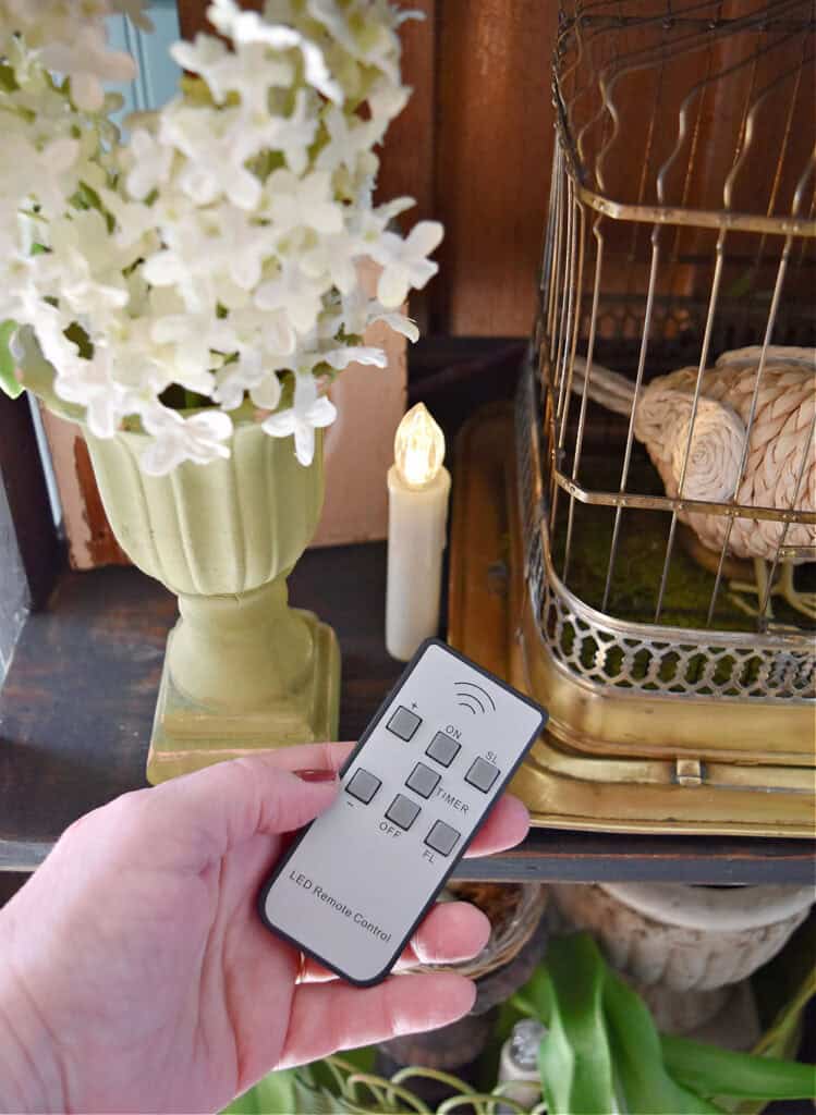 This end of the hallway does not have an outlet. But lighting adds so much to pretty vignettes and helps you enjoy all the pretty details at night. I’ve got two vintage pin up lamps here that I cut the electric cord off. THESE handy rechargeable bulbs come with a remote control with all kinds of possibilities. They are great for a spot like this.