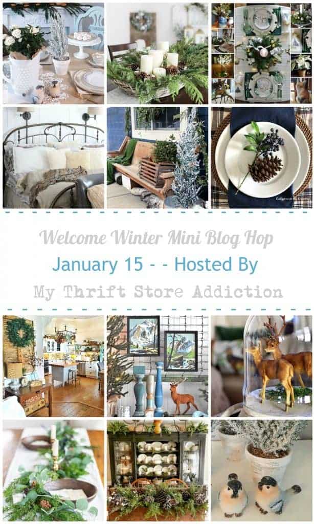 To help with your winter decorating ideas, I’m joining a great group of friends today for a fun Welcome Winter Blog Hop, organized by Cecilia at My Thrift Store Addiction. Cecilia is a vintage lover like me and has rounded up a talented bunch of creative bloggers, each with their own style. If you’re visiting from Shiplap and Shells, welcome! I’m sure you enjoyed Kim’s cozy cottage tour; she styles everythings so beautifully:)