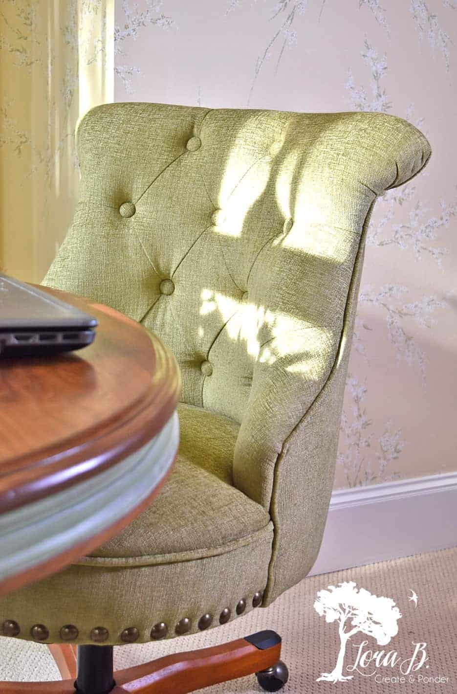 Although I love refreshed vintage furniture, I knew I needed to purchase a new chair in order to sit comfortably for hours on end. Because my workspace is in our bedroom, the desk chair needed to be pretty and match the decor. With a little searching and price comparing online (because real stores were all closed), I found the perfect fit. I’m thrilled with the soft, celery green button tufted desk chair I bought. It’s totally comfortable, can be raised or lowered and leans back, so I can vary my posture. It’s curved lines match perfectly with my refreshed, vintage desk table!