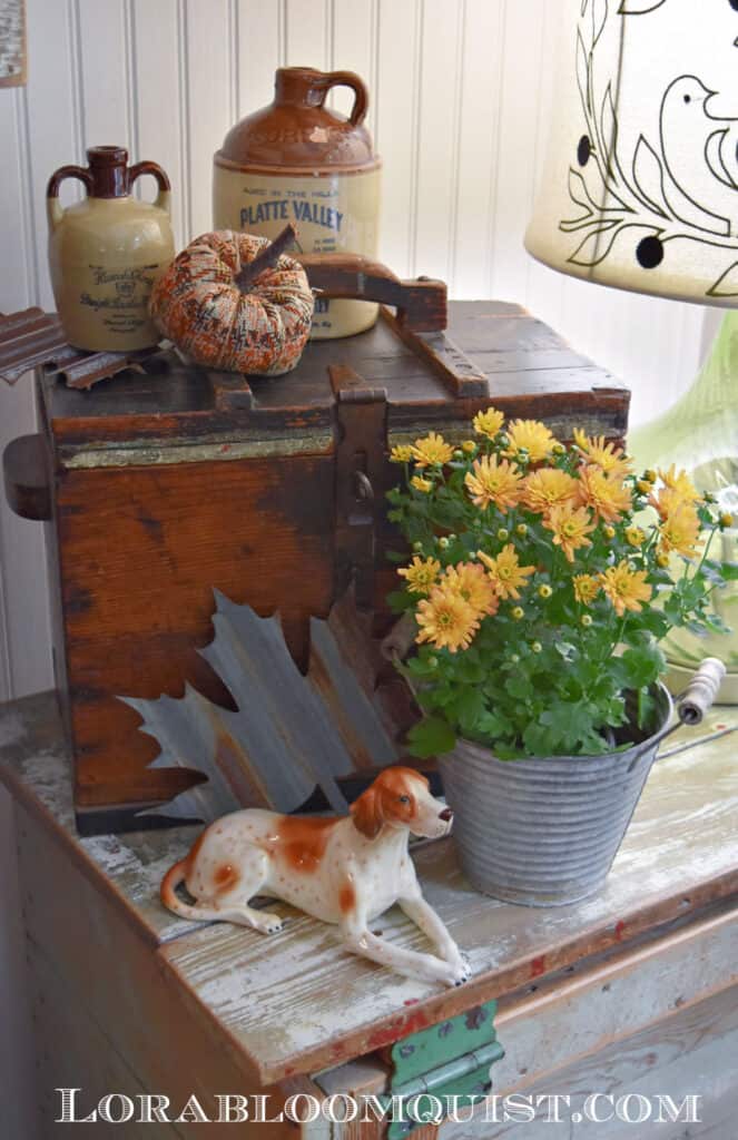 There are so many things about your fall décor endearing to me starting with the fabulous dog art. What a find. Also the little ceramic dog, I’ve been wanting to add ceramics to my dog collecting for years. And the tole lamp, oh my. I had one long ago and but kept the shade and haven’t found a use for it yet. The duck hunt theme is so very clever.