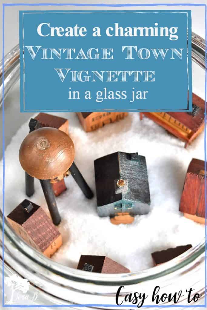 Anything you put into a glass jar or under a glass cloche becomes instant art! It’s the easiest way to create pretty decor for your home. Years ago, I had picked up an old, handmade toy town curbside {“Little Town”} and had wondered who had made it so meticulously. Sadly, it’s been collecting dust in the basement because there are no littles at my house to play with it. But today, the little buildings are getting a new lease on life. Here’s how to create a Vintage Town Christmas Vignette.
